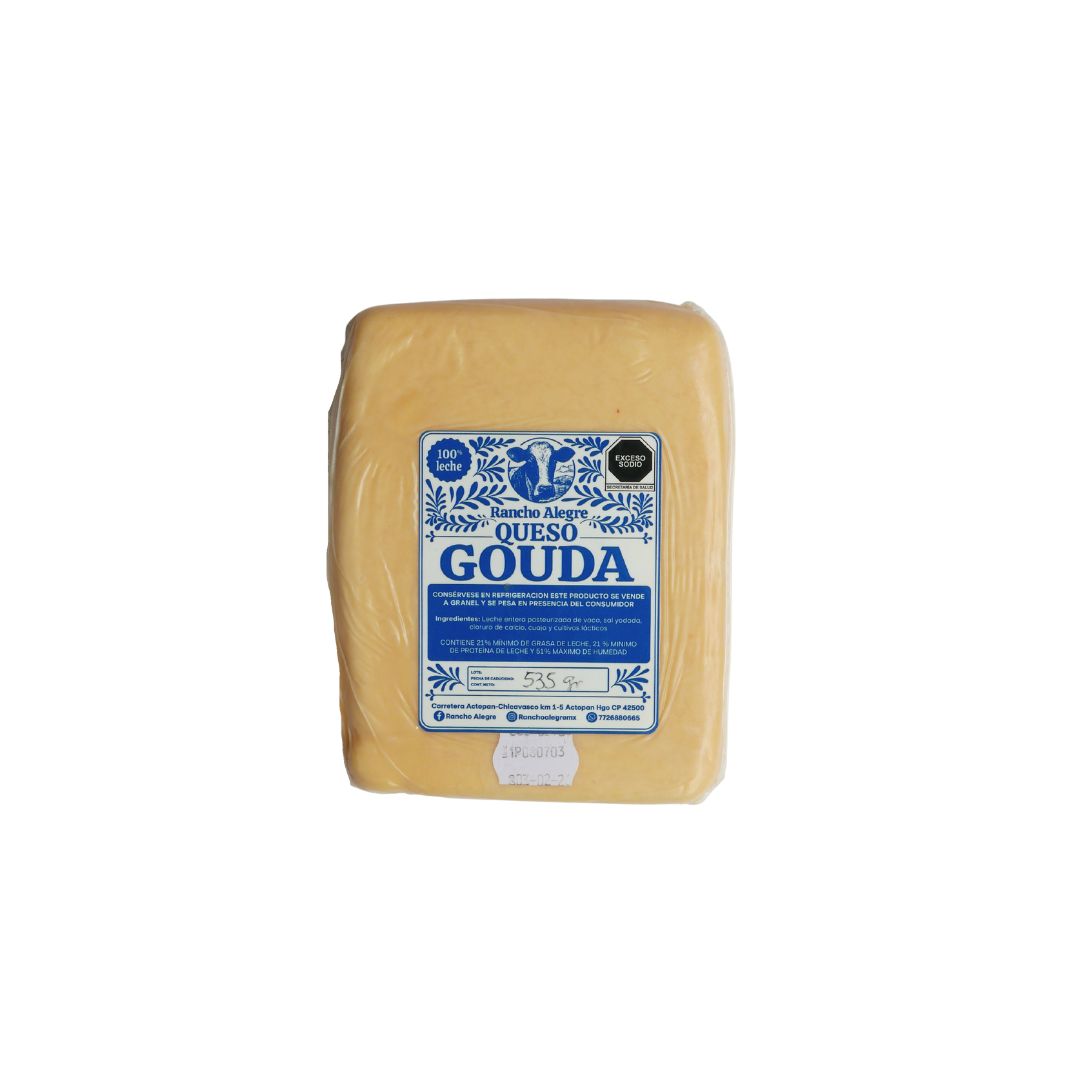 El gouda es un queso semiduro de forma rectangular con la superficie lateral convexa, formando una curva suave que une la superficie plana superior con la inferior.