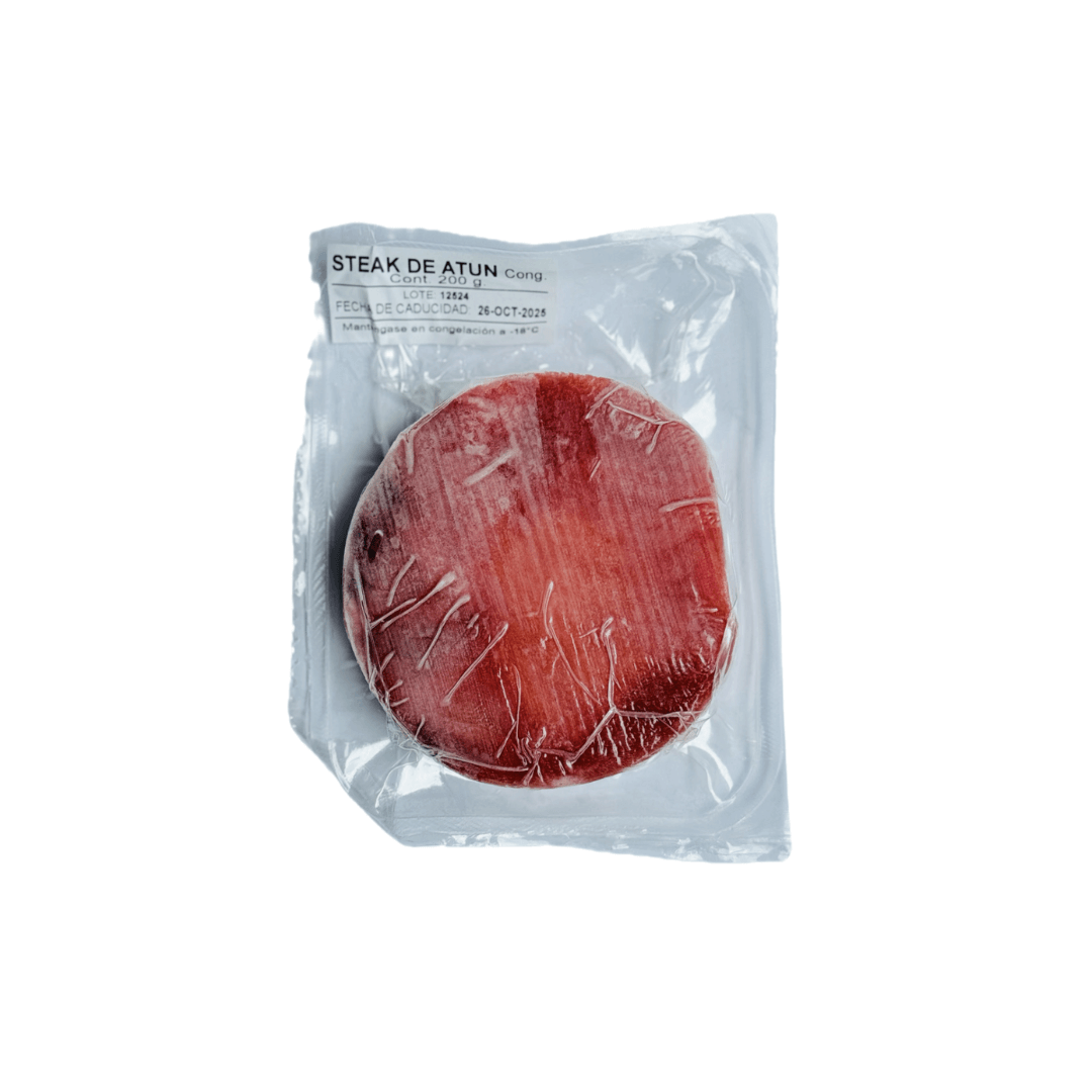 Medallones de Atún Aleta Amarilla congelados obtenidos de lomos rojos crudos, empaquetado al vacío.