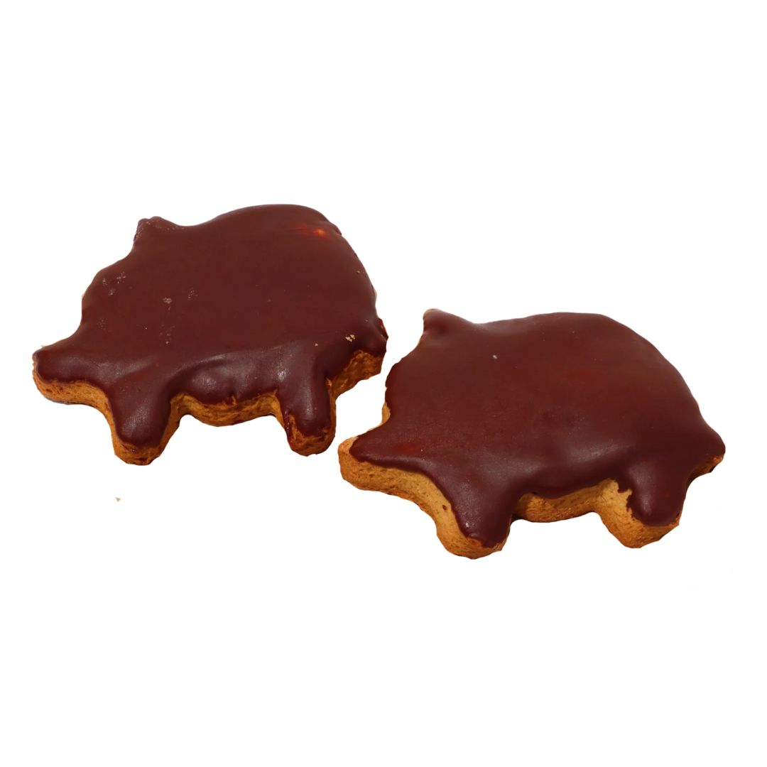 Cerdito de piloncillo elaborado con chocolate semi amargo, 50% cacao y 50% piloncillo . La masa de la galleta esta hecha con anís y canela.